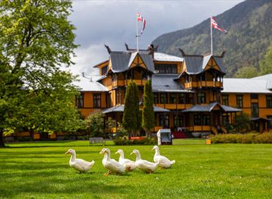 Fra første stund var hotellet et mektig anlegg, bygd i europeisk trearkitektur som var ført over i den norske dragestilen, og glanstiden tok til. «Et slott» som var omgitt av drager og spir, av mystikk og storhet. Hit kom såvel kongelige som lokale gjester. Hit kom det engelske aristokratiet. Hit kom Kong Oscar II av Norge og Sverige, kongen av Siam, keiser Wilhelm av Tyskland og kong Leopold av Belgia. Hit kom kong Haakon VII og dronning Maud med kronprins Olav. Hit kom prominente gjester frå heile Europa. De stelte til ball og danset vals. I et halvt århundre danset de seg gjennom gleder og sorger, gjennom krig og fred.