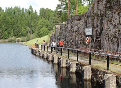 Nedenfor sluseanlegget er det ventebrygge for fritidsbåter. Nasjonal sykkelrute nr. 2,…