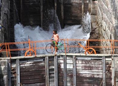 Før du sykler over brua, anbefaler vi en avstikker ned til Ulefoss sluse. Dette er den første slusen på reisen fra Norsjø mot Dalen. Her kan du se kanalbåtene sluse, besøke sommerkafeen og kjenne på den historiske kanalatmosfæren.