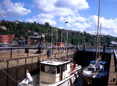 Skien sluse er inngangsporten til vakre Telemarkskanalen. Her blir du tatt vel imot av slusevokterne, som gir deg informasjon og opplæring til ferden videre. Her er det også en stor ventebrygge på nedsiden av sluseanlegget og vi anbefaler at du fortøyer her og tar turen opp for en prat og billettkjøp.