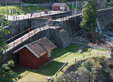Nedenfor sluseanlegget er det ventebrygge for fritidsbåter. Nasjonal sykkelrute nr. 2,…