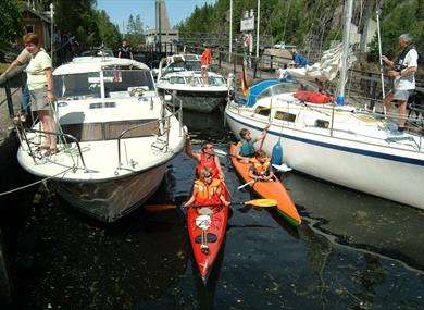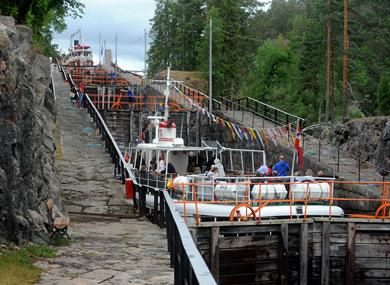 Nedenfor sluseanlegget er det ventebrygge for fritidsbåter. Nasjonal sykkelrute nr. 2,…